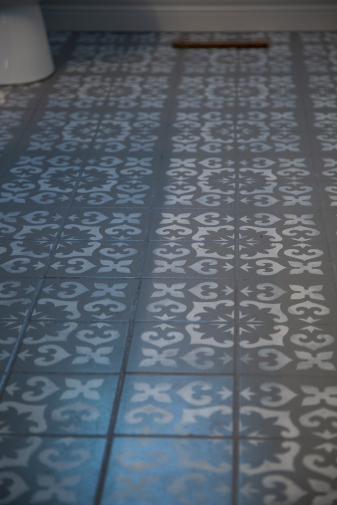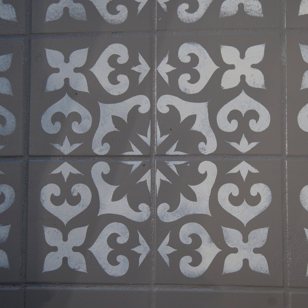 Step 5: Apply your stencil pattern. I as really lucky to find a stencil that fit perfectly on 4 tiles. I used a stencil brush because I wanted an uneven, handmade look, but if you want a more precise pattern you can use a roller. Start with the tiles where you can use the full stencil pattern. And start at the furthest spot working toward the door so you can get out when you’re done.