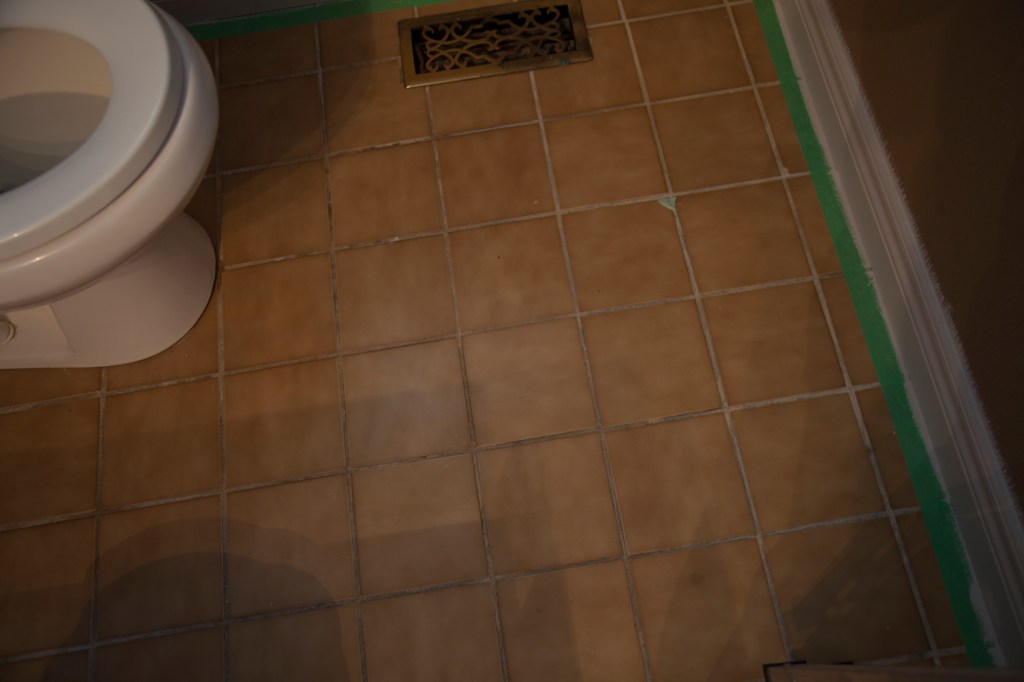 In part 1 I painted the porcelain tile of my tub surround. Next came walls and trim and finally … the ceramic tile floor.