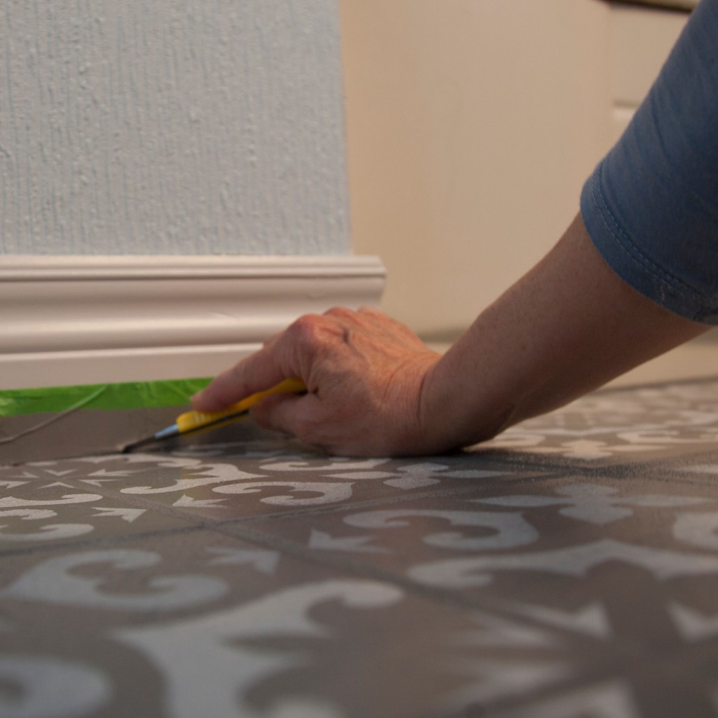 Once you finish the whole tiles you’ll need to start cutting your stencil down to fit the spaces that are smaller. Plan that out carefully so you don’t run out of stencil before you finish. It’s a great idea to buy 2 of the same stencil to make sure you can fit all the spaces.