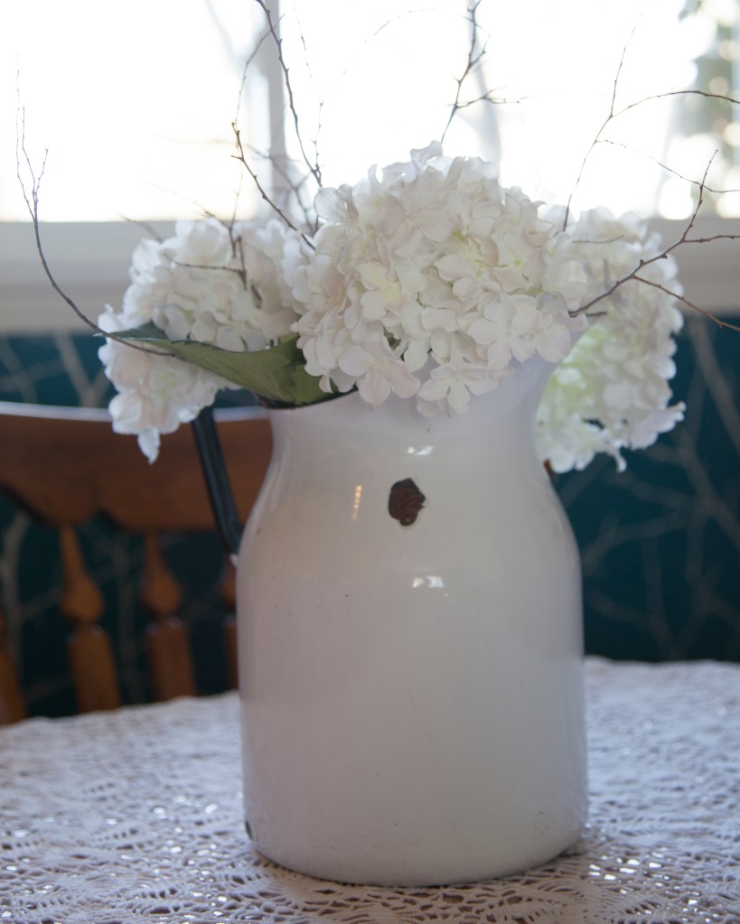 I love this design style for it’s clean and casual feel. It incorporates lots of wood and soft fabrics, baskets and, of course, plants. I’m a thrift store shopper with an eye for unusual vintage pieces and they fit in perfectly with this decor. The trick is to not overload your space with these items. I would suggest you decide on 3 items to start collecting to incorporate into your space. Then you can build from there as you expand your designing to the next room. If you start in the kitchen, for instance, you could collect colanders or wooden spoons. Enamel wear is also great to collect. This sweet enamel pitcher instantly adds a touch of farmhouse.