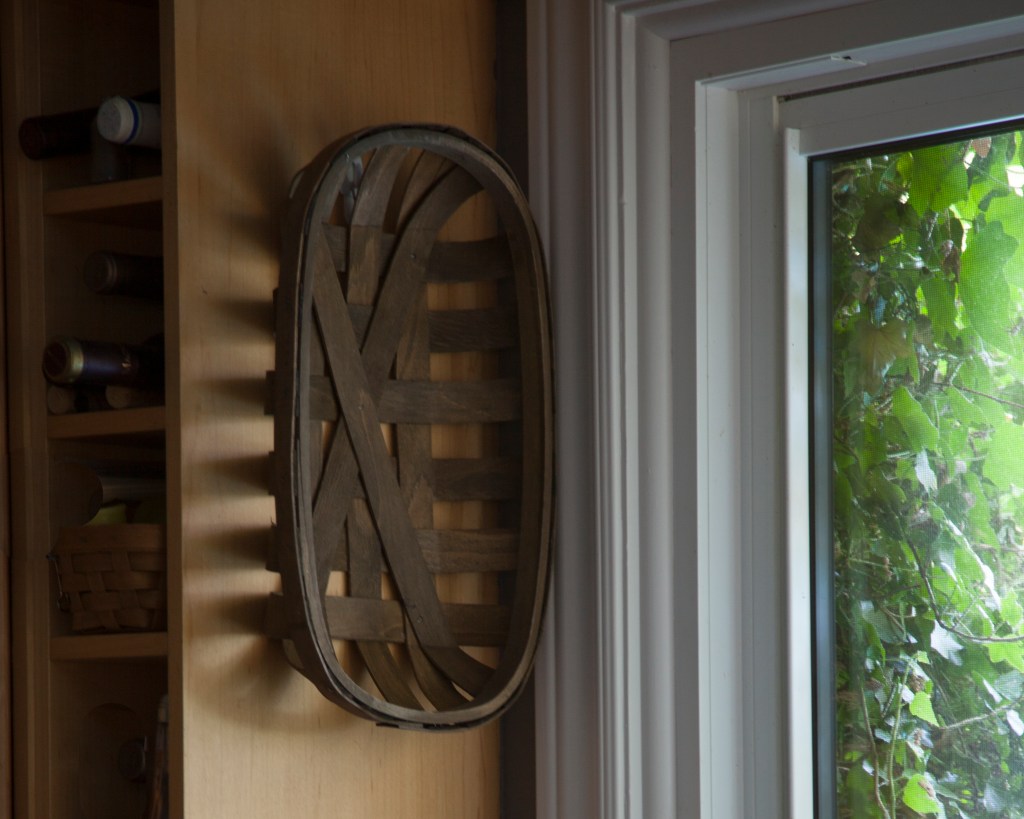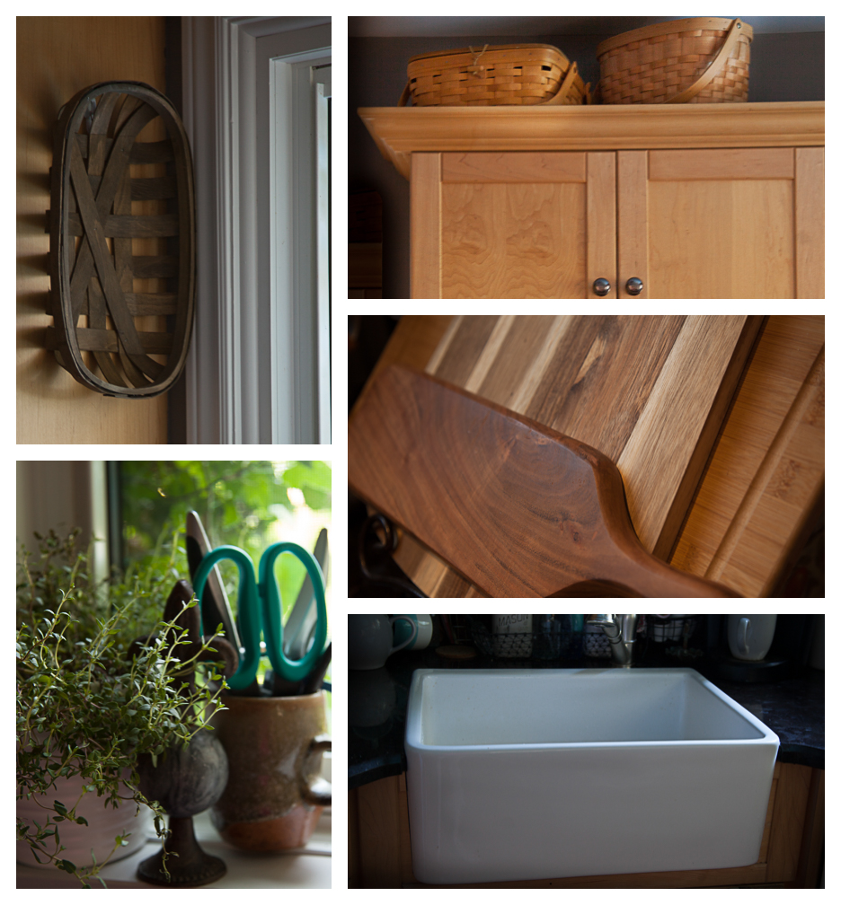 Display your baskets and wooden cutting boards to add warmth to your kitchen. And nothing says Farmhouse more than a bright, white apron sink. Even the linens you choose will add to the style. Flour sack tea towels in a stripe or check are perfect. Baskets, when displayed on the wall, provide texture in themselves and also in how light plays off them.
